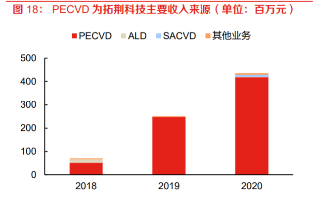 PECVD 设备为公司主要收入来源,研发持续投入。拓荆科技多年来致力于高端半导体设备的研 发、生产、销售和技术服务,已成为国家高新技术代表企业之一。目前公司主要专注于薄膜沉积 设备,其产品包括等离子体增强化学气相沉积(PECVD)设备、原子层沉积(ALD)设备和次常 压化学气相沉积(SACVD)设备三大系列,已广泛适用于国内 14nm 及以上制程集成电路制造产 线,并持续加强 10nm 及以下先进制程产品的验证与测试。2020 年,公司实现营业收入 4.36 亿 元,同比大幅增长 73%,毛利率 34%。其中,PECVD 设备营收为 4.18 亿元,是公司主要收入来 源;ALD 和 SACVD 设备分别为 184 万元、867 万元。公司近年来持续强化产品研发投入,2020 年研发费用为 1.23 亿元,占营业收入比 28%。