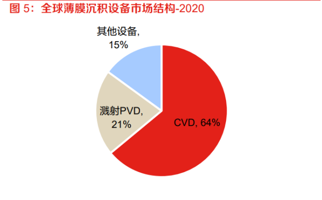 目前,全球薄膜沉积设备中 CVD类设备占比最高,2020年占比 64%,溅射PVD设备占比 21%。 CVD 设备中,PECVD 是主流的设备类型,2020 年在 CVD 设备中占比 53%,其次为 ALD 设备, 占比 20%。(报告来源:未来智库)