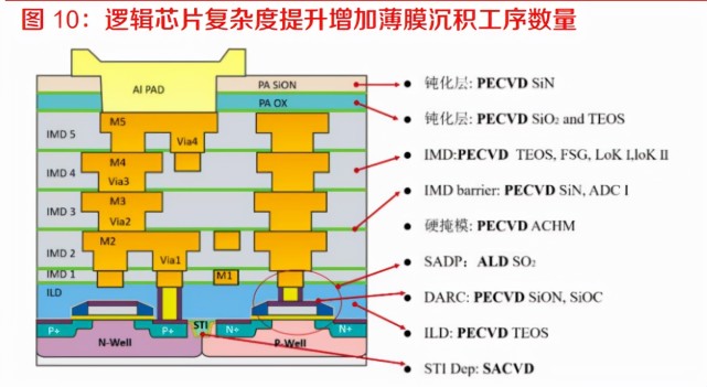 芯片工艺进步及结构复杂化拉动高性能薄膜设备需求。随着集成电路的持续发展,晶圆制造工艺 不断走向精密化,芯片结构的复杂度也不断提高,需要在更微小的线宽上制造,制造商要求制备 的薄膜品种随之增加,最终用户对薄膜性能的要求也日益提高。这一趋势对薄膜沉积设备产生了更高的技术要求,市场对于高性能薄膜设备的依赖逐渐增加。以 CVD设备演进为例,相比传统的 APCVD、LPCVD设备,PECVD设备在相对较低的反应温度下形成高致密度、高性能薄膜,不破 坏已有薄膜和已形成的底层电路,实现更快的薄膜沉积速度,已成为芯片制造薄膜沉积工艺中运 用最广泛的设备种类,未来 HDPCVD、FCVD 应用有望增加。ALD 设备亦有望在 14nm 及以下制 程逻辑芯片、17nm 及以下 DRAM 芯片中得到更广泛应用;国内长鑫存储已实现 19nm DRAM 芯片量产,未来 17nm 亦有望取得突破,带动国内高端薄膜沉积设备需求。